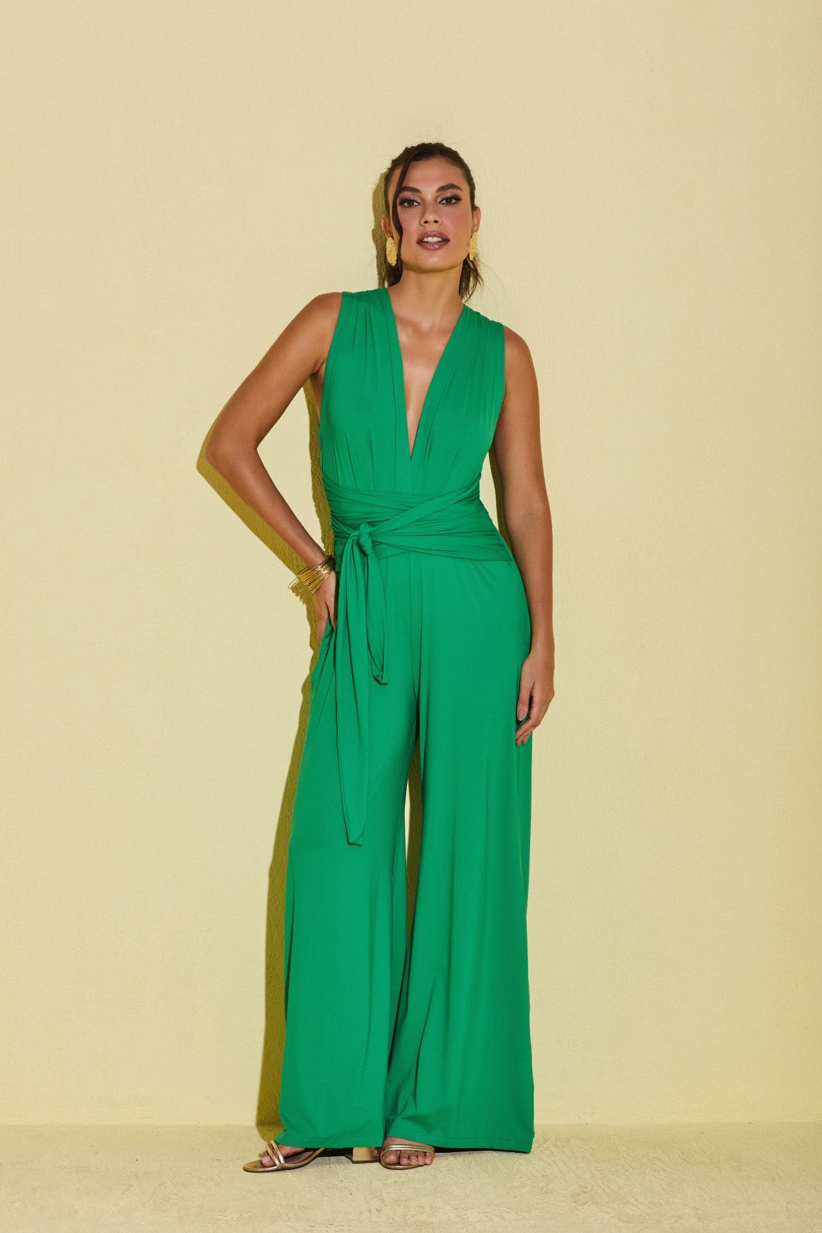 Macacão em fluity (malha fria macia e fluida, sustentável e com proteção UV) verde. Sem mangas com decote em "V", pernas amplas e faixa para amarração na cintura. Ref. Voar: 32510079 Composição: 87% Poliamida / 13% Elastano
