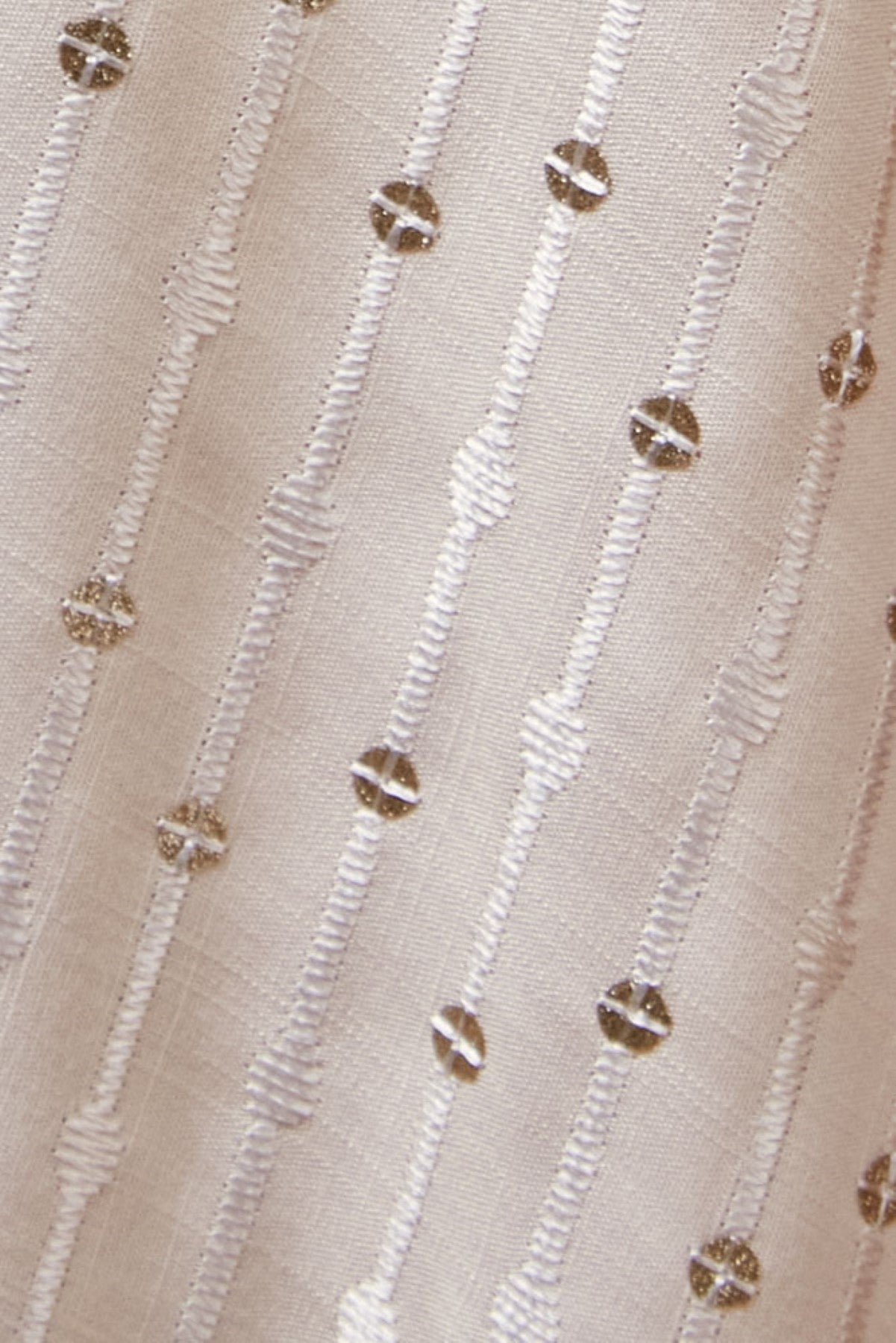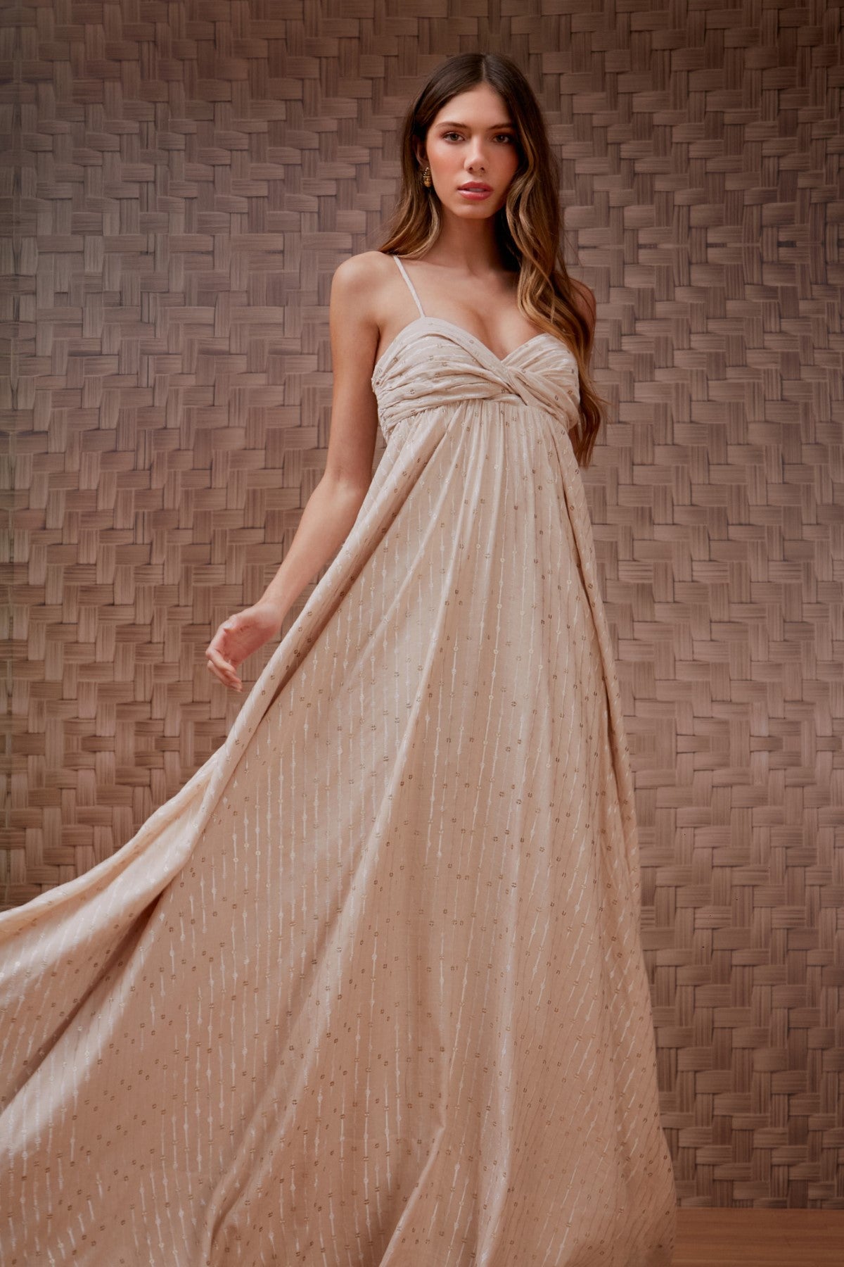 Vestido longo com bojo drapeado, recorte abaixo do busto, alças finas, saia godê com movimento e caimento perfeito. Confeccionado em viscose bege bordada com fios com leve brilho e mini paetês dourados. Composição: 100% Viscose