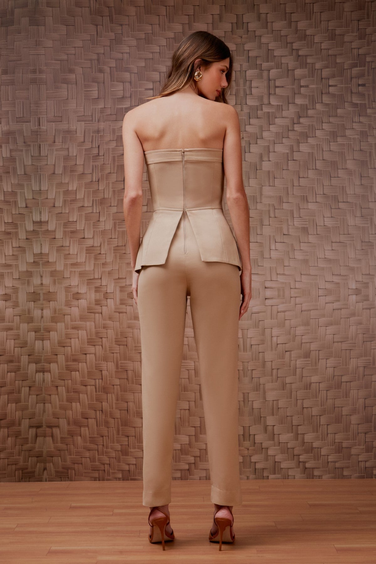 Macacão bege sem alças com calça reta com nervura. Possui botões forrados duplos frontais e bolsos utilitários com pregas em sobreposição na cintura. É uma peça chique perfeita para diversas ocasiões. Composição: 52% Algodão / 44% Poliamida / 4% Elastano