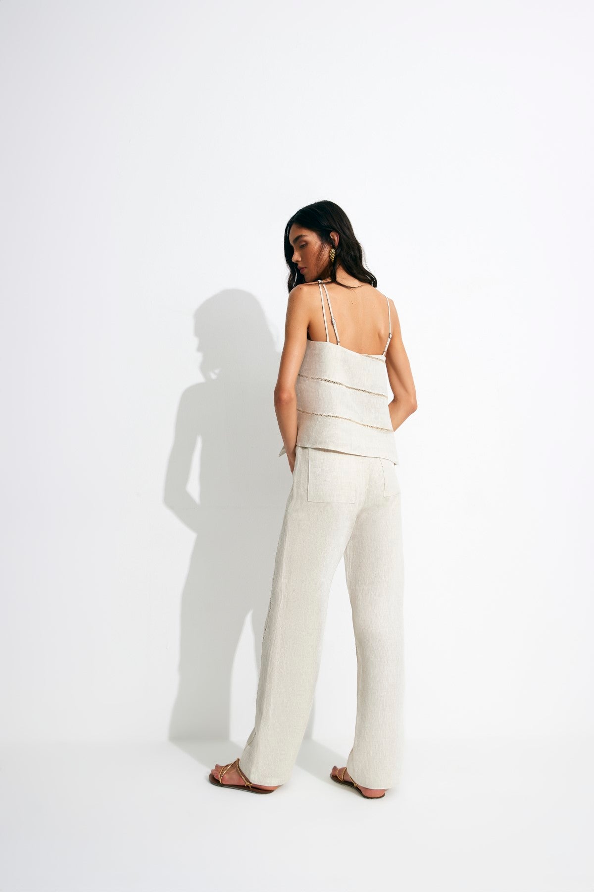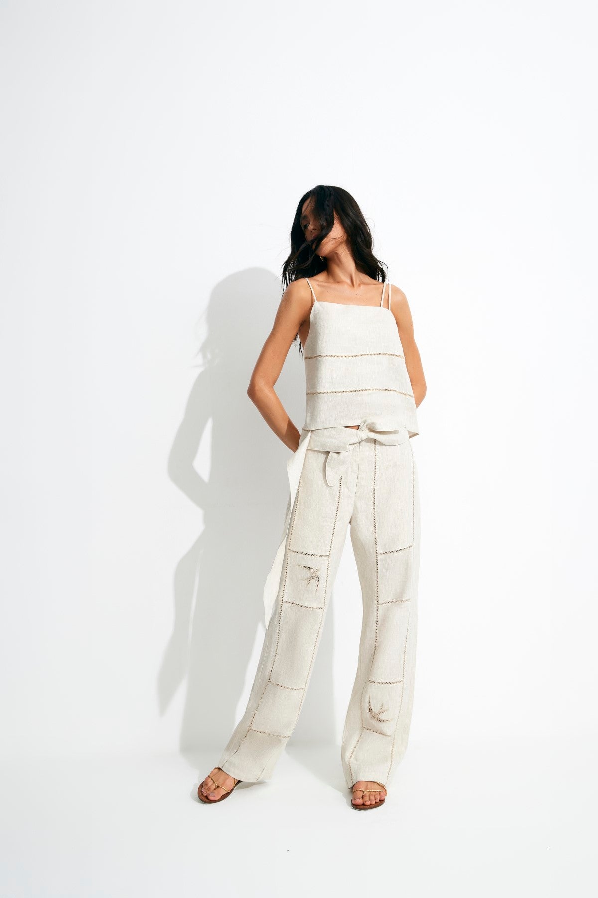 Blusa em linho puro com aspecto rústico e caimento suavemente encorpado. A peça possui modelagem assimétrica com um efeito de faixa que envolve o corpo e com um detalhe cai num movimento leve e fluido. Composição: 100% Linho