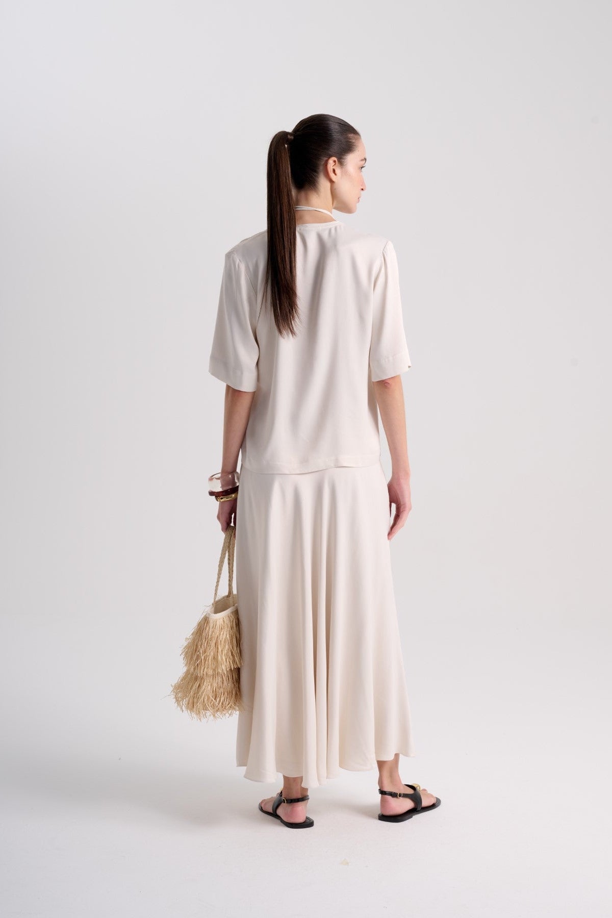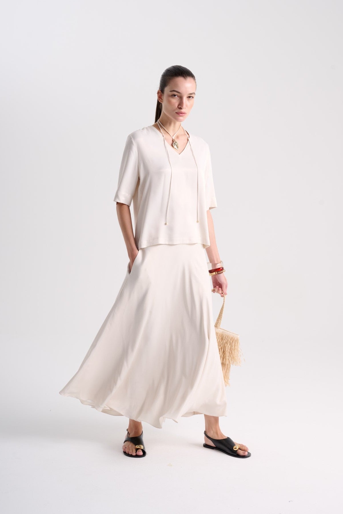 Blusa em viscose acetinada bege claro com leve fluidez, mangas médias e decote em “V”. Acompanha pingente. Composição: 100% Viscose