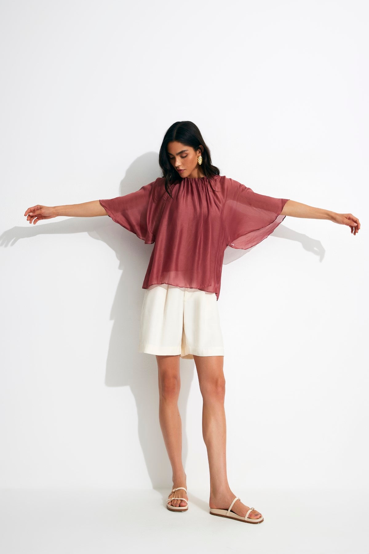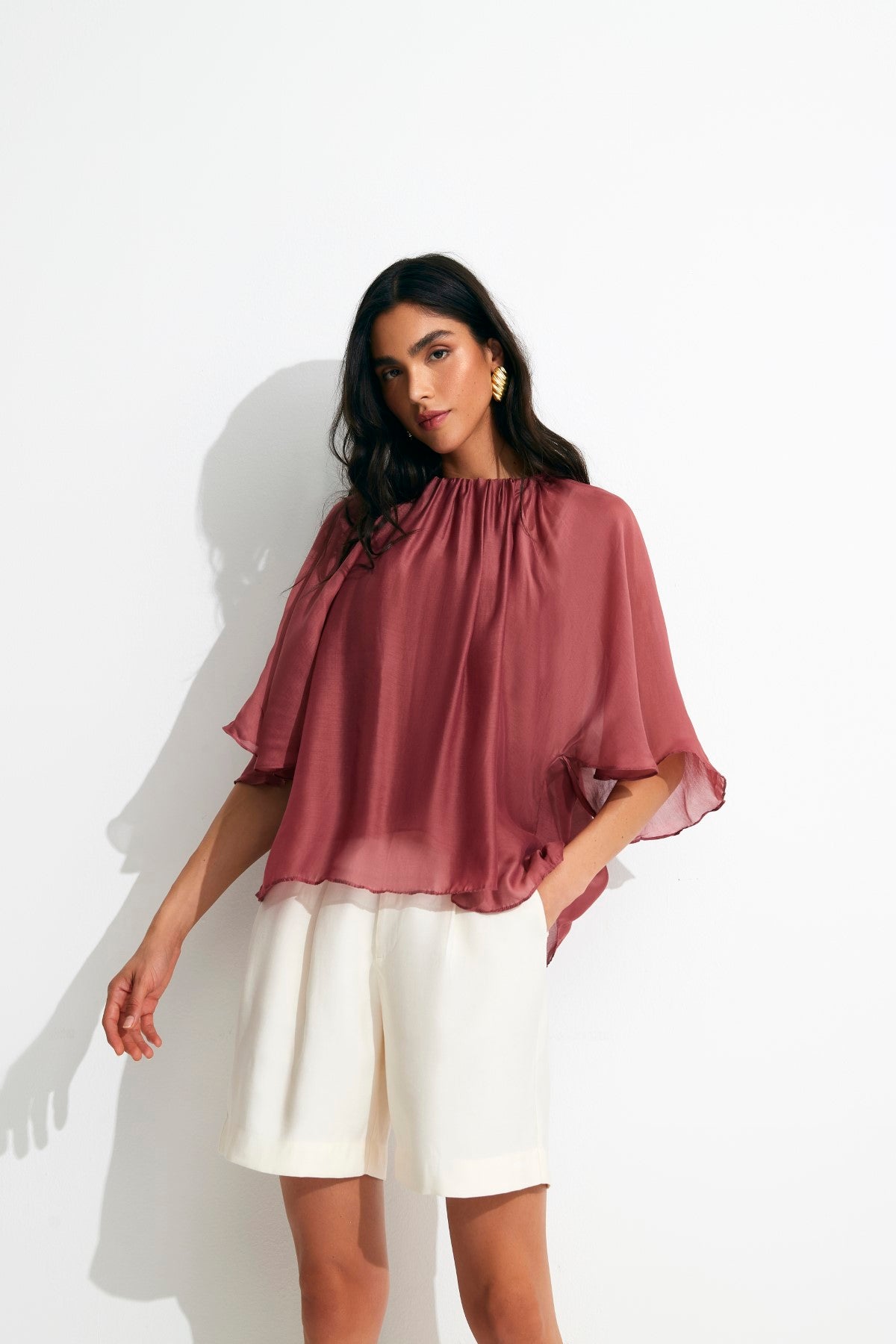 Blusa em tecido de modal e seda, que oferece um toque extremamente suave e um caimento leve e fluido. Possui modelagem mais soltinha, com franzido do decote e não possui o recorte de cava, proporcionando mangas fluidas que dão muito mais movimento a peça. Composição: 72% Modal / 28% Seda