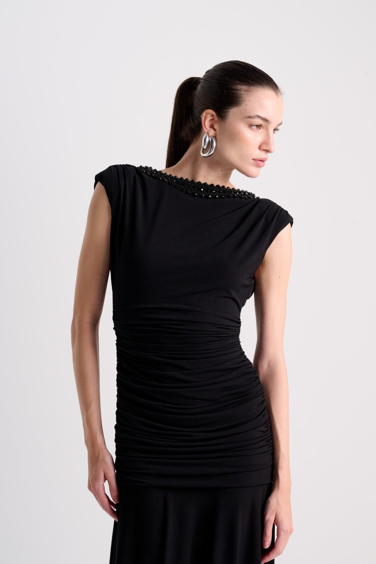 Vestido longo em malha jet set. Possui decote reto com aplicação de pedraria na frente, decote em “V” com pedraria nas costas, mangas bem curtas e drapeado no tronco. Composição: 96% Poliéster / 4% Elastano